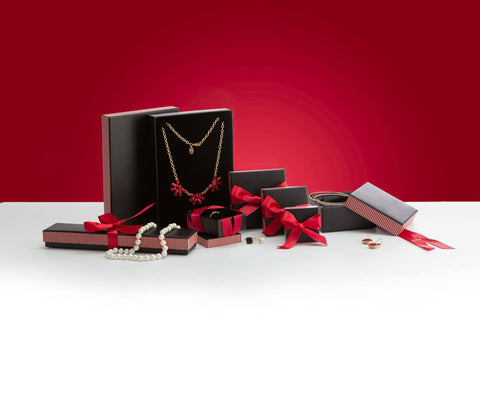 Vividly colored jewelry boxes can turn gifting into a sensational experience. These striped boxes are perfect for adding bright color tones to your store all year round and especially during holiday or sale season. Each box is topped with a large bow for a dramatic presentation.