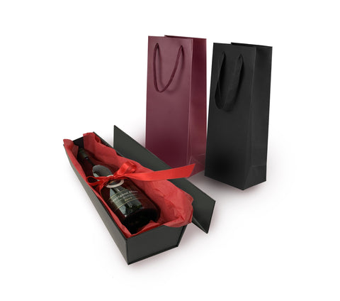 Crafted with strong paperboard, our wine bottle boxes define understated luxury with their smooth feel and hidden magnetic closure. If you are hand-delivering your gifts locally, package your wine bottles in our wine gift bags that are made of superior paper and will hold up when carried. (Consider first packaging them in a wine box to add an “unboxing experience” to your gift.)